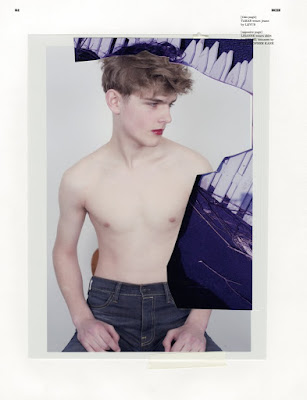 Connotation: This image carries contains of the blurring of gender roles as the young man is posed in a more feminine way the female model has a more masculine stance. This is interesting when linked to the abstract swirling patterns behind the photographs as it adds to the idea of chaos or confusion.